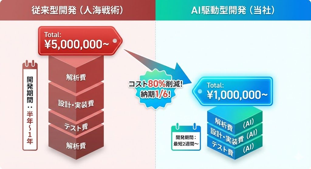 | 項目 | 従来型開発(人海戦術) | AI駆動型開発(当社) | コスト削減の根拠 |